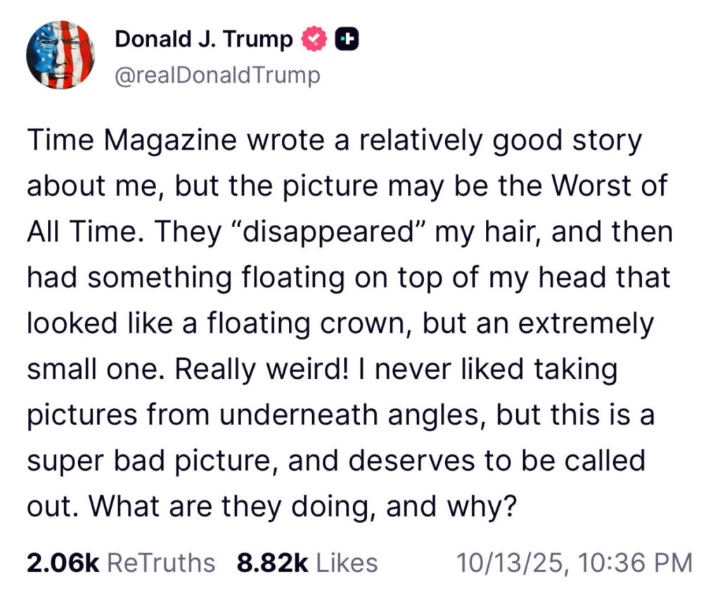 ഗാസയില് ട്രംപിന്റെ നയതന്ത്ര വിജയത്തെക്കുറിച്ച് ടൈം മാഗസിന് താരതമ്യേന നല്ലൊരു ലേഖനം നല്കിയെങ്കിലും, കവറിലെ ചിത്രം ട്രംപിന് തീരെ ഇഷ്ടപ്പെട്ടില്ല. താഴെനിന്നുള്ള ആംഗിളില്, സൂര്യന് തലയുടെ പിന്നില് വരുന്ന രീതിയില് എടുത്ത ആ ചിത്രത്തെ അദ്ദേഹം വിശേഷിപ്പിച്ചത് ‘സൂപ്പര് ബാഡ്’ എന്നാണ്. ട്രൂത്ത് സോഷ്യലിലൂടെയാണ് ട്രംപ് തന്റെ അതൃപ്തി പരസ്യമാക്കിയത്.