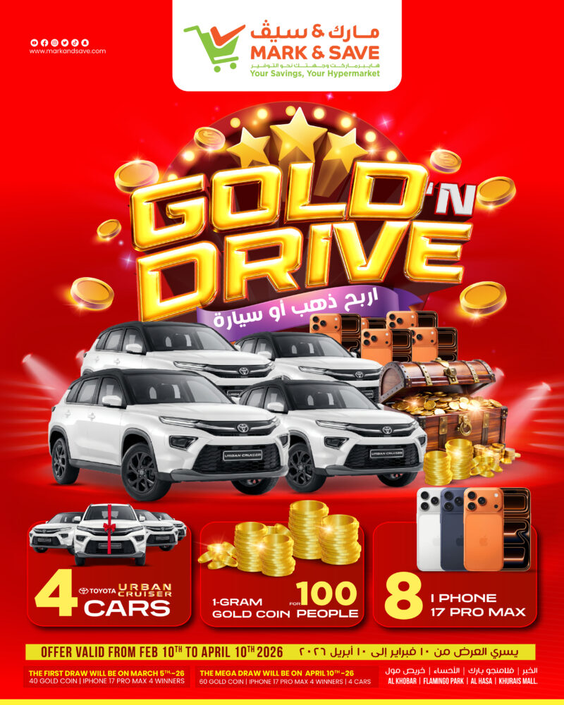 നാല് ടൊയോട്ട അർബൻ ക്രൂയിസർ കാറുകൾ, നൂറ് പേർക്ക് ഓരോ ഗ്രാം സ്വർണ്ണ നാണയങ്ങൾ, എട്ട് ഐഫോൺ 17 പ്രോ മാക്‌സ് സ്മാർട്ട്‌ഫോണുകൾ എന്നിങ്ങനെ ആകർഷകമായ സമ്മാനങ്ങളാണ് ഉപഭോക്താക്കളെ കാത്തിരിക്കുന്നത്. പദ്ധതിയുടെ ഭാഗമായുള്ള ആദ്യ നറുക്കെടുപ്പ് മാർച്ച് 5-നും, മെഗാ ഡ്രോ ഏപ്രിൽ 10-നും നടക്കും. റിയാദിലെ എക്സിറ്റ് 26-ലുള്ള ഫ്‌ലാമിംഗോ പാർക്ക്, ഖുറൈസ് മാൾ, കൂടാതെ അൽകോബാർ, അൽഹസ എന്നിവിടങ്ങളിലെ മാർക്ക് & സേവ് ശാഖകളിൽ നിന്ന് ഷോപ്പിംഗ് നടത്തുന്നവർക്ക് ഈ സമ്മാന പദ്ധതിയിൽ പങ്കാളികളാകാൻ അവസരമുണ്ട്.