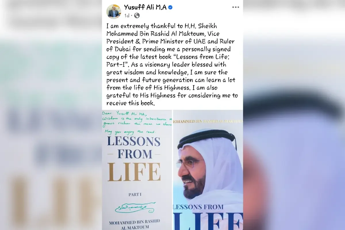 ആദരണീയനായ യുഎഇ വൈസ് പ്രസിഡന്റും പ്രധാനമന്ത്രിയും ദുബൈ ഭരണാധികാരിയുമായ ശൈഖ് മുഹമ്മദ് ബിൻ റാഷിദ് അൽ മക്തൂം എനിക്ക് അദ്ദേഹത്തിന്റെ ഏറ്റവും പുതിയ പുസ്തകമായ ‘ലെസ്സൻസ് ഫ്രം ലൈഫ്: പാർട്ട് ഒന്ന്’ൻ്റെ കൈയ്യൊപ്പോടു കൂടിയ പകർപ്പ് അയച്ചുതന്നതിൽ ഞാൻ അത്യധികം നന്ദിയുള്ളവനാണ്. വലിയ ജ്ഞാനവും അറിവും ദീർഘവീക്ഷണവുമുള്ള നേതാവ് എന്ന നിലയിൽ, അദ്ദേഹത്തിന്‍റെ ജീവിതത്തിൽ നിന്ന് ഇപ്പോഴത്തെ തലമുറയ്ക്കും ഭാവി തലമുറയ്ക്കും ഒരുപാട് കാര്യങ്ങൾ പഠിക്കാനുണ്ടെന്ന് എനിക്ക് ഉറപ്പാണ്. ഈ പുസ്തകം സ്വീകരിക്കാൻ എന്നെ പരിഗണിച്ചതിൽ ഞാൻ അദ്ദേഹത്തോട് കടപ്പെട്ടിരിക്കുന്നു’- യൂസഫലി കുറിച്ചു. ഓരോ വരിയും വായിക്കുമ്പോൾ അത് വെറും പുസ്തകത്താളുകളല്ല, മറിച്ച് ദുബൈയിയുടെ ചരിത്രത്തിലേക്ക് തുറക്കുന്ന വാതിലുകളാണെന്ന് യൂസഫലി കൂട്ടിച്ചേർത്തു. ശൈഖ് മുഹമ്മദ് സ്വന്തം കൈപ്പട കൊണ്ടെഴുതിയ സന്ദേശമുള്ള പേജും പുസ്തകത്തിന്റെ പുറംചട്ടയും പങ്കുവച്ചുകൊണ്ടാണ് യൂസഫലിയുടെ കുറിപ്പ്. ദുബൈയിയുടെ വളർച്ചയ്ക്ക് പിന്നിലെ ഊർജവും ഒരു ഭരണാധികാരിയുടെ ചിന്തകളും അനുഭവങ്ങളുമാണ് ‘ലെസ്സൻസ് ഫ്രം ലൈഫ്: പാർട്ട് ഒന്ന്’ എന്ന പുസ്തകത്തിലുള്ളത്.