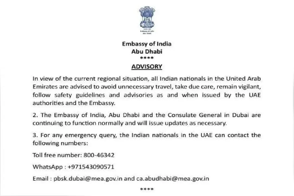 അബുദാബി– ഇറാൻ-ഇസ്രായിൽ സംഘർഷം രൂക്ഷമായ സാഹചര്യത്തിൽ യു.എ.ഇയിലെ പ്രവാസികൾക്ക് അതീവ ജാഗ്രത നിർദേശവുമായി ഇന്ത്യൻ എംബസി. അനാവശ്യ യാത്രകൾ ഒഴിവാക്കണമെന്നും കൂടുതൽ ജാഗ്രതപുലർത്തണ​മെന്നും എംബസി നിർദേശിച്ചു. നിലവിലെ സാഹചര്യത്തിൽ യു.എ.ഇ അധികൃതർ പുറത്തിറക്കുന്ന എല്ലാ സുരക്ഷ മാർഗനിർദേശങ്ങളും പാലിക്കണം. ഇന്ത്യൻ എംബസിയുടെയും ദുബൈ ഇന്ത്യൻ കോൺസുലേറ്റിന്‍റെയും പ്രവർത്തനം സാധാരണ നിലയിൽ മുന്നോട്ടുപോകുന്നുണ്ട്​. ആവശ്യമായ നിർദേശങ്ങൾ യഥാസമയം പുറത്തിറക്കും. അടിയന്തര സാഹചര്യങ്ങളിൽ അന്വേഷണത്തിനായി 80046342 എന്ന ടോൾ ഫ്രീ നമ്പറിൽ വിളിക്കാം. കൂടാതെ +971543090571 എന്ന വാട്​സാപ്പ്​ നമ്പറിലും ബന്ധപ്പെടാം. ഇ-മെയിൽ: [email protected], [email protected].