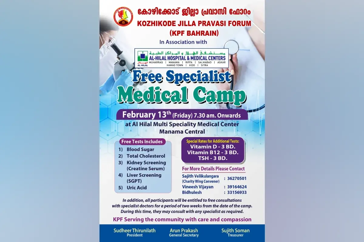 മനാമ– കോഴിക്കോട് ജില്ലാ പ്രവാസി ഫോറം (കെ.പി. എഫ്) ബഹ്റൈന്, അല് ഹിലാല് മെഡിക്കല് സെന്റര് മനാമയുമായി ചേര്ന്ന് മെഡിക്കല് ക്യാമ്പ് സംഘടിപ്പിക്കുന്നു. ഫെബ്രുവരി 13 വെള്ളിയാഴ്ച രാവിലെ 7.30 മുതല് ഉച്ചക്ക് 12 മണി വരെ മനാമ ബസ്സ് സ്റ്റേഷന് സമീപമുള്ള അല് ഹിലാല് മെഡിക്കല് സെന്ററില് നടത്തുന്ന മെഡിക്കല് ക്യാമ്പില് യൂറിക് ആസിഡ്, സെറം ക്രിയാറ്റിന് (കിഡ്നി സ്ക്രീനിംഗ് ), ട്രൈ ഗ്ലിസറൈഡ്, ബ്ലഡ് ഷുഗര്, കൊളസ്ട്രോള്, എസ് ജി.പി.ടി (ലിവര് സ്ക്രീനിംഗ്) എന്നിവയടങ്ങുന്ന രക്ത പരിശോധനയും ഡോക്ടറുടെ സേവനവും സൗജന്യമായി ലഭിക്കുമെന്ന് പ്രസിഡന്റ് സുധീര് തിരുന്നിലത്ത്, ജനറല് സെക്രട്ടറി അരുണ് പ്രകാശ്, ട്രഷറര് സുജിത്ത് സോമന് എന്നിവര് പത്രക്കുറിപ്പിലൂടെ അറിയിച്ചു. മെഡിക്കല് ക്യാമ്പില് പങ്കെടുക്കാന് താല്പര്യമുള്ളവര് 36270501, 39164624, 33156933. നമ്പരുകളില് വിളിച്ചോ വാട്സപ്പില് മെസ്സേജ് അയച്ചോ പേര് രജിസ്റ്റര് ചെയ്യണമെന്ന് ചാരിറ്റി വിംഗ് കണ്വീനര് സജിത്ത് വെള്ളികുളങ്ങര അറിയിച്ചു.