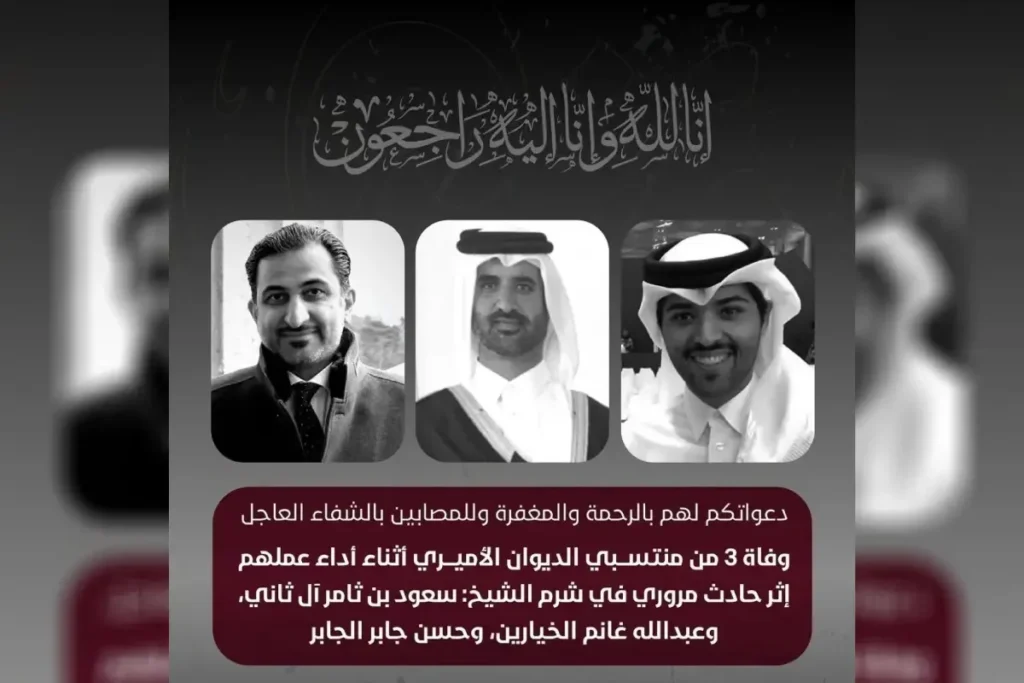 ഖത്തറിന്റെ ഈജിപ്തിലെ എംബസി ‘എക്‌സ്’ പോസ്റ്റിലൂടെ മരണവിവരം സ്ഥിരീകരിച്ചു. സമ്മേളനത്തിന് മുന്നോടിയായി ഷറം അൽ ശൈഖിലേക്ക് പോവുകയായിരുന്ന പ്രോട്ടോക്കോൾ ടീമിലെ അംഗങ്ങളാണ് അപകടത്തിൽപ്പെട്ടതെന്ന് ഈജിപ്തിയൻ ആരോഗ്യ-സുരക്ഷാ വൃത്തങ്ങൾ അറിയിച്ചു. നഗരത്തിൽ നിന്ന് ഏകദേശം 50 കിലോമീറ്റർ അകലെയുള്ള വളവിൽ വെച്ച് ഇവർ സഞ്ചരിച്ച കാർ മറിയുകയായിരുന്നു.