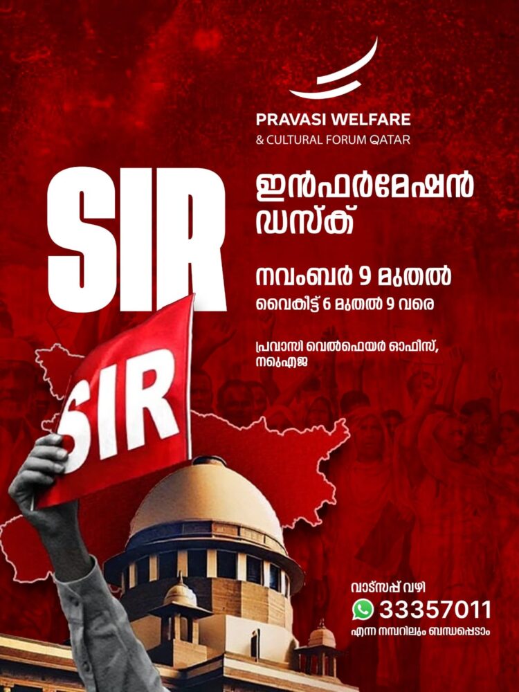ദോഹ – തീവ്ര വോട്ടര് പട്ടിക പരിഷ്കരണം കേരളത്തില് കൂടി കേന്ദ്ര തെരഞ്ഞെടുപ്പ് കമ്മീഷന് ആരംഭിച്ച സാഹചര്യത്തില് പ്രവാസികളുടെ ആശങ്കയകറ്റാനും ലിസ്റ്റില് പേരുകള് ചേര്ക്കുന്നതിലും അനുബന്ധ രേഖകള് ശരിയാക്കാന്നതിനുമുള്ള സംശയങ്ങൾ അകറ്റാനും പ്രവാസി വെല്ഫെയര് ഇന്ഫര്മേഷന് ഡെസ്ക് ആരംഭിച്ചു. സംസ്ഥാന പ്രസിഡന്റ് ആര് ചന്ദ്രമോഹന് ഇന്ഫര്മേഷന് ഡെസ്ക് ഉദ്ഘാടനം ചെയ്തു. തദ്ദേശ സ്വയം ഭരണ സ്ഥാപനങ്ങളിലേക്കുള്ള തെരഞ്ഞെടുപ്പ് പടിവാതിലെത്തി നില്ക്കെ തിടുക്കപ്പെട്ട് കേരളത്തില് എസ്.ഐ.ആര് പ്രഖ്യാപിച്ചത് ജനങ്ങളെ ദുരിതത്തിലാഴ്ത്തുമെന്നും അര്ഹരായവര് ലിസ്റ്റില് നിന്ന് പുറത്തായി പോകാതിരിക്കാൻ പ്രവാസികൾ ജാഗ്രത പാലിക്കണമെന്നും അദ്ദേഹം പറഞ്ഞു. വോട്ടർ പട്ടിക പരിഷ്കരണത്തിന്റെ ഭാഗമായി നടക്കുന്ന നടപടി ക്രമത്തിൽ അർഹരായവരെ വോട്ടർപട്ടികയിൽ ഉൾപ്പെടുത്തന്നതിലും അനർഹർ കയറി പറ്റാതിരിക്കാനും രാജ്യത്തെ മതേതര രാഷ്ട്രീയ പാര്ട്ടികള് ജാഗ്രത കാണിക്കണമെന്നും ചന്ദ്രമോഹന് ആവശ്യപ്പെട്ടു.