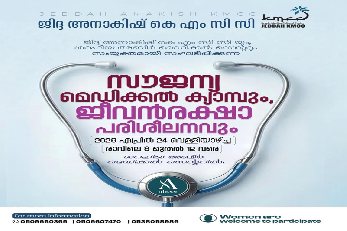 ജിദ്ദ– ജിദ്ദ അനാകിഷ് കെ എം സി സി യും, അബീർ മെഡിക്കൽ സെൻ്റർ ശറഫിയയും സംയുക്തമായി നടത്തുന്ന സൗജന്യ മെഡിക്കൽ ക്യാമ്പും, ജീവൻ രക്ഷാ പരിശീലനവും ഇന്ന് (വെള്ളിയാഴ്ച) രാവിലെ 8 മുതൽ ശറഫിയ അബീർ മെഡിക്കൽസിൽ വെച്ച് നടക്കുമെന്ന് അനാകിഷ് കെ എം സി സി ഭാരവാഹികളായ ബഷീർ കീഴില്ലത്ത്,എ.സി മുജിബ് പാങ്ങ്, അബ്ദുൽ ഫത്താഹ് താനൂർ, റഹ്മത്ത് അലി എരഞ്ഞിക്കൽ എന്നിവർ വാർത്താകുറിപ്പിൽ അറിയിച്ചു .ഈ അവസരം സാധാരണക്കാരായ പ്രവാസി സഹോദരി, സഹോദരങ്ങൾ ഉപയോഗപെടുത്തണമെന്ന് ഭാരവാഹികൾ അഭ്യർത്ഥിച്ചു. വിദ്ധക്തരായ ഡോക്ടർമാരുടെ പരിശോധനയിൽ ഉണ്ടായിരിക്കും.
