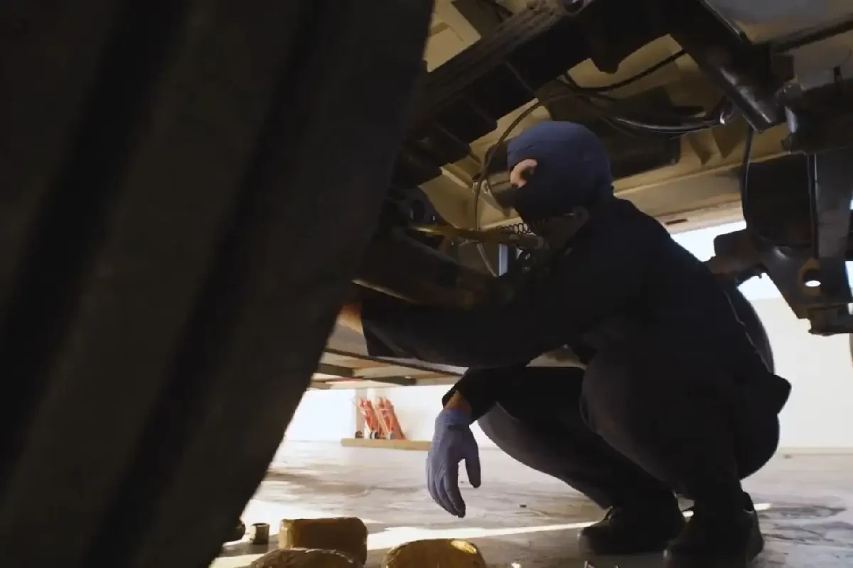 സൗദി, ഒമാൻ അതിർത്തിയിലെ റുബ്ഉൽഖാലി അതിർത്തി പോസ്റ്റ് വഴി ലോറിയുടെ പിൻവശത്തെ ആക്സിലുകൾക്കുള്ളിൽ ഒളിപ്പിച്ച് കടത്താൻ ശ്രമിച്ച വൻ മയക്കുമരുന്ന് ശേഖരം സകാത്ത്, ടാക്സ് ആന്റ് കസ്റ്റംസ് അതോറിറ്റി ഉദ്യോഗസ്ഥൻ പുറത്തെടുക്കുന്നു