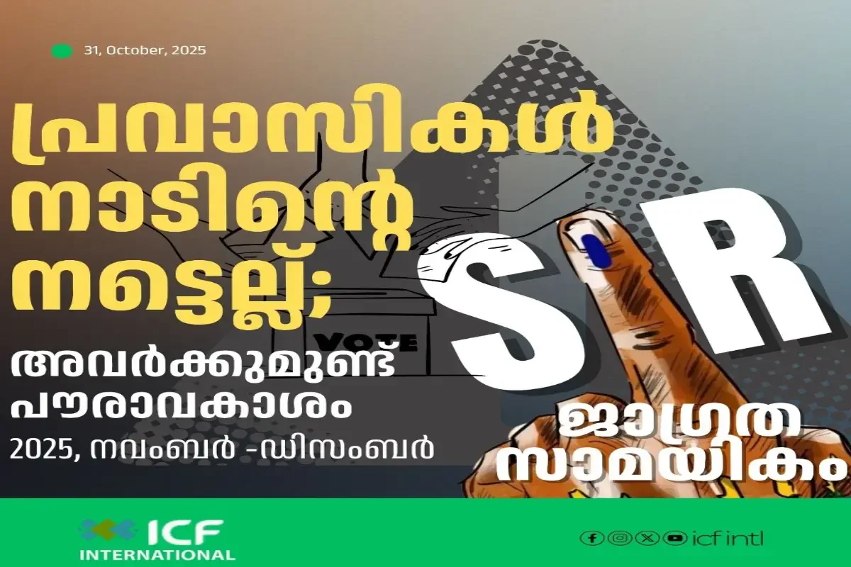 റിയാദ്– കേരളത്തിൽ ആരംഭിച്ച വോട്ടർ പട്ടികയുടെ തീവ്ര വോട്ടർ പട്ടിക പരിഷ്ക്കരണത്തിൽ ( എസ്ഐആർ) പ്രവാസികളെ ബോധവൽകരിക്കുന്നതിനും ആവശ്യമായ നിർദേശങ്ങൾ നൽകുന്നതിനുമായി ഇന്ത്യൻ കൾച്ചറൽ ഫൗണ്ടേഷൻ (ഐസിഎഫ്) ജാഗ്രതാ കാമ്പയിൻ ആചരിക്കും. പ്രവാസികൾ നാടിന്റെ നട്ടെല്ല് എന്നതാണ് കാമ്പയിൻ പ്രമേയം.നവംബർ, ഡിസംബർ മാസങ്ങളിൽ നടക്കുന്ന കാമ്പയിനിന്റെ ഭാഗമായി വിവിധ പരിപാടികൾ ആവിഷ്‌കരിച്ചിട്ടുണ്ട്.