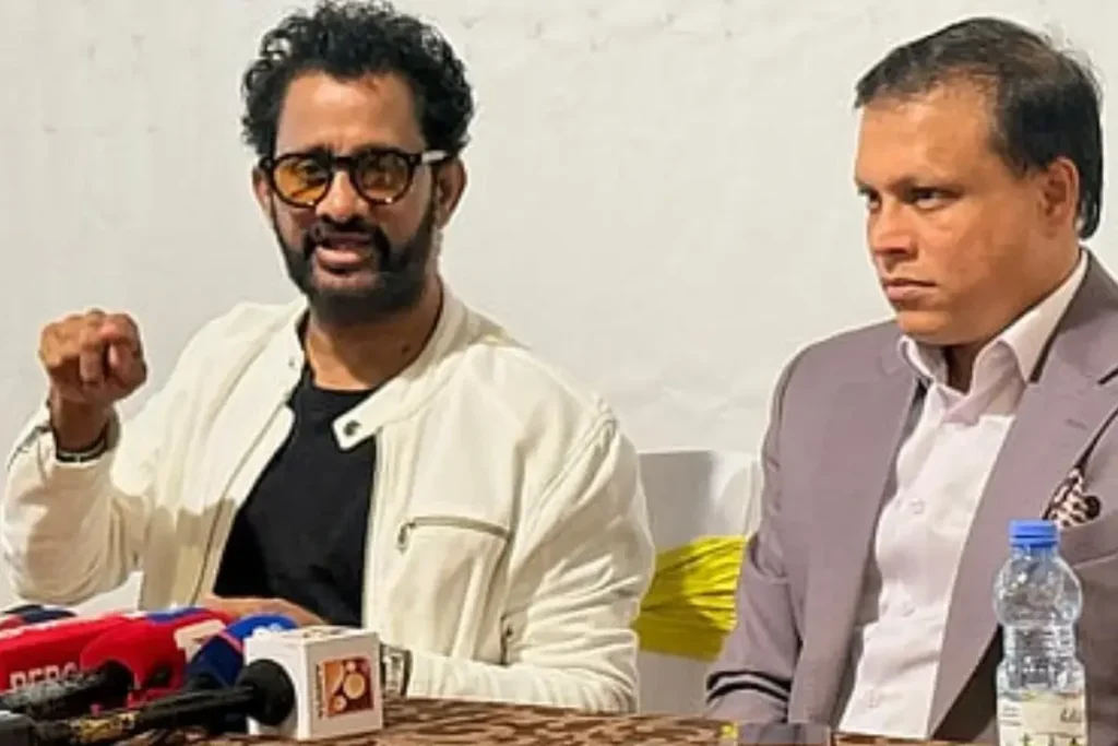 റസൂൽ പൂക്കുട്ടി ദുബൈയിൽ വാർത്താ സമ്മേളനത്തിൽ സംസാരിക്കുന്നു. ജമാദ് ഉസ്മാൻ സമീപം.