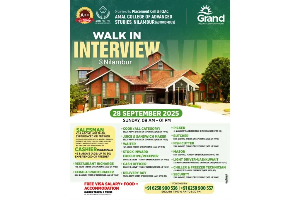 അമൽ കോളേജ് ഓഫ് അഡ്വാൻസ്ഡ് സ്റ്റഡീസ് പ്ലയിസ്മെന്റ് സെൽ, ഐ ക്യു.എ.സി എന്നിവ ഗ്രാൻഡ് ഗ്രൂപ്പുമായി ചേർന്ന് ആണ് നിയമന പരിപാടി സംഘടിപ്പിക്കുന്നത്. താല്പര്യമുള്ളവർക്ക് നേരിൽ എത്താവുന്നതാണ്. കൂടുതൽ വിവരങ്ങൾക്ക്: +916238900536, +916238900537 ബന്ധപ്പെടുക.