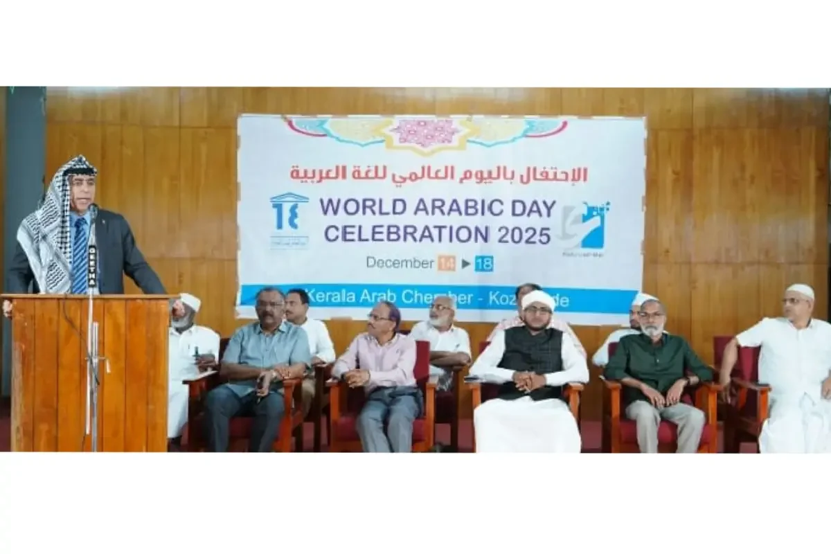കേരള അറബ് ചേംബറിന്റെ ആഭിമുഖ്യത്തിൽ കോഴിക്കോട്ട് നടന്ന അന്താരാഷ്ട്ര അറബിഭാഷ വാരോഘോഷ പരിപാടികളുടെ ഉദ്ഘാടനം ഫലസ്തീൻ അംബാസിഡർ ഡോ. അബ്ദുല്ല മുഹമ്മദ് അബൂ ഷാവേഷ് നിർവഹിക്കുന്നു