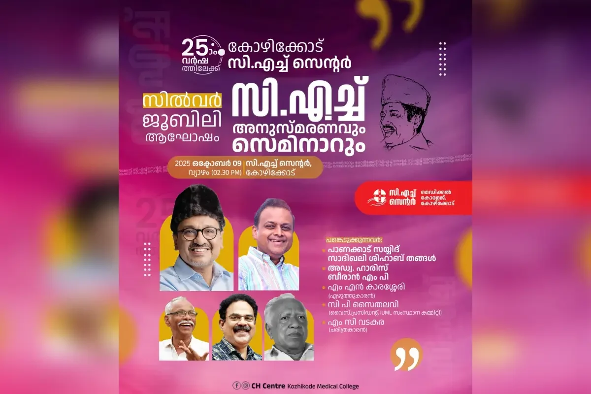 കോഴിക്കോട്– 25ാം സിൽവർ ജൂബിലി ആഘോഷത്തിന്റെ ഭാഗമായി സിഎച്ച് അനുസ്മരണവും സെമിനാറും സംഘടിപ്പിക്കുന്നു. ഒക്ടോബർ 9 വ്യാഴാഴ്ച കോഴിക്കോട് സി എച്ച് സെന്ററിൽ വെച്ചാണ് പരിപാടി സംഘടിപ്പിക്കുക.