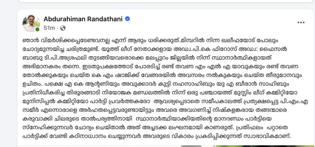 ഇടതുപക്ഷത്തോട് പോരടിച്ച് രണ്ട് തവണ എം എൽ എ യാവുകയും രണ്ട് തവണ തോൽക്കുകയും ചെയ്ത കെ എം ഷാജിക്ക് വേങ്ങരയിൽ അവസരം നൽകുകയും ചെയ്ത തീരുമാനവും ഉചിതം. പക്ഷെ എ കെ ആന്റണിയും അവുക്കാദർ കുട്ടി നഹസാഹിബും യു എ ബീരാൻ സാഹിബും പ്രതിനിധീകരിച്ച തിരൂരങ്ങാടി നിയോജക മണ്ഡലത്തിൽ നിന്ന് ഒരു പഞ്ചായത്ത് മുസ്ലിം ലീഗ് കമ്മിറ്റിയോ മുനിസിപ്പൽ കമ്മിറ്റിയോ പാർട്ടി പ്രവർത്തകരോ ആവശ്യപ്പെടാതെ സമീപകാലത്ത് പ്രത്യക്ഷപ്പെട്ട പി.എം.എ സമീർ എന്നൊരാളെ അർഹതപ്പെട്ടവരുണ്ടായിട്ടും അവരെ അവഗണിച്ച് നിഷ്കളങ്കരായ തങ്ങന്മാരെ കരുവാക്കി ചിലരുടെ താൽപര്യത്തിനായി സ്ഥാനാർത്ഥിയാക്കിയതിന്റെ മാനദണ്ഡം പാർട്ടിയെ സ്നേഹിക്കുന്നവർ ചോദ്യം ചെയ്താൽ അത് അച്ചടക്ക ലംഘനമായി കാണരുത്. പ്രതിഫലം പറ്റാതെ പാർട്ടിക്ക് വേണ്ടി കഠിനാധ്വാനം ചെയ്യുന്നവർ അവരുടെ വികാരം പ്രകടിപ്പിക്കുന്നത് സ്വാഭാവികമാണ്.- അബ്ദുറഹ്മാൻ രണ്ടത്താണി പറഞ്ഞു.