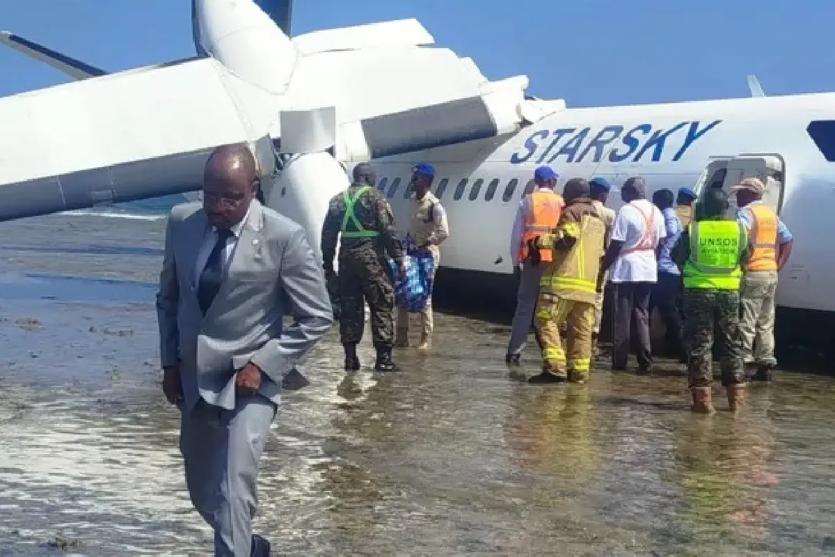 മൊഗാദിഷു– സൊമാലിയൻ തലസ്ഥാനമായ മൊഗാദിഷുവിലെ അന്താരാഷ്ട്ര വിമാനത്താവളത്തിൽ, 50 യാത്രക്കാരുമായി പറന്നുയർന്ന വിമാനം സാങ്കേതിക തകരാറിനെത്തുടർന്ന് അടിയന്തരമായി ഇറക്കുന്നതിനിടെ നിയന്ത്രണം നഷ്ട്ടപെട്ട് റൺവേയിൽ നിന്ന് തെന്നിമാറി കടൽതീരത്ത് എത്തി. സ്റ്റാർസ്‌കൈ ഏവിയേഷൻ കമ്പനിയുടെ ഫോകർ-50 വിമാനമാണ് അപകടത്തിൽപ്പെട്ടത്. ചൊവ്വാഴ്ച രാവിലെ 50 യാത്രക്കാരും 5 ജീവനക്കാരുമായി വിമാനത്താവളത്തിൽ നിന്ന് പറന്നുയർന്ന ഉടൻ തന്നെ വിമാനത്തിന് സാങ്കേതിക തകരാർ ശ്രദ്ധയിൽപ്പെട്ടു. ഇതോടെ പൈലറ്റ് വിമാനം തിരിച്ചിറക്കാൻ അനുമതി തേടുകയായിരുന്നു. എന്നാൽ ലാൻഡിംഗിനിടെ നിയന്ത്രണം നഷ്ടമായ വിമാനം റൺവേ മറികടന്ന് കടൽതീരത്തിലേക്ക് ചെന്നുനിന്നു.