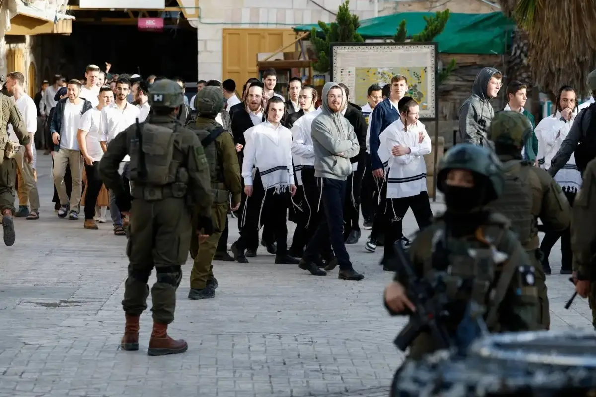 വെസ്റ്റ് ബാങ്കിലെ ഹെബ്രോണില്‍ ജൂതകുടിയേറ്റക്കാരുടെ പര്യടനത്തിനിടെ കാവല്‍നില്‍ക്കുന്ന ഇസ്രായിലി സൈനികര്‍