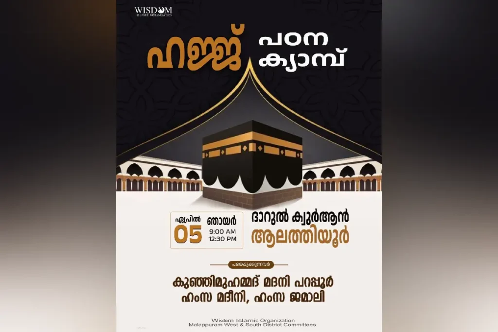 തിരൂർ– വിസ്ഡം ഇസ്ലാമിക് ഓർഗനൈസേഷൻ മലപ്പുറം വെസ്റ്റ്, സൗത്ത് ജില്ലാ സമിതികൾ ചേർന്ന് സംഘടിപ്പിക്കുന്ന ജില്ലാ ഹജ്ജ് പഠന ക്യാമ്പ് ഏപ്രിൽ 5 ഞായർ രാവിലെ 8.30 മുതൽ 12.30 വരെ ആലത്തിയൂർ ദാറുൽ ഖുർആൻ ക്യാമ്പസ് ഓഡിറ്റോറിയത്തിൽ വച്ച് നടക്കും. പ്രമുഖ ഖുർആൻ വിവർത്തകനും പണ്ഡിതനുമായ കുഞ്ഞുമുഹമ്മദ് മദനി പറപ്പൂർ നേതൃത്വം നൽകും. പണ്ഡിതന്മാരായ ഹംസ മദീനീ, ഹംസ ജമാലി എന്നിവർ ക്ലാസുകൾ നയിക്കും. സംശയനിവാരണത്തിന് അവസരം ഉണ്ടായിരിക്കും.