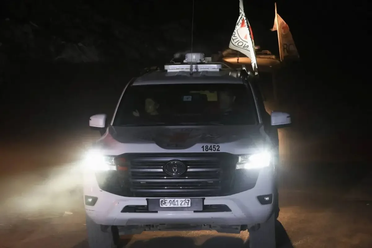 ഹമാസ് കൈമാറിയ ഇസ്രായിലി ബന്ദിയുടെ മൃതദേഹം റെഡ് ക്രോസ് വാഹനത്തില്‍ കൊണ്ടുപോകുന്നു