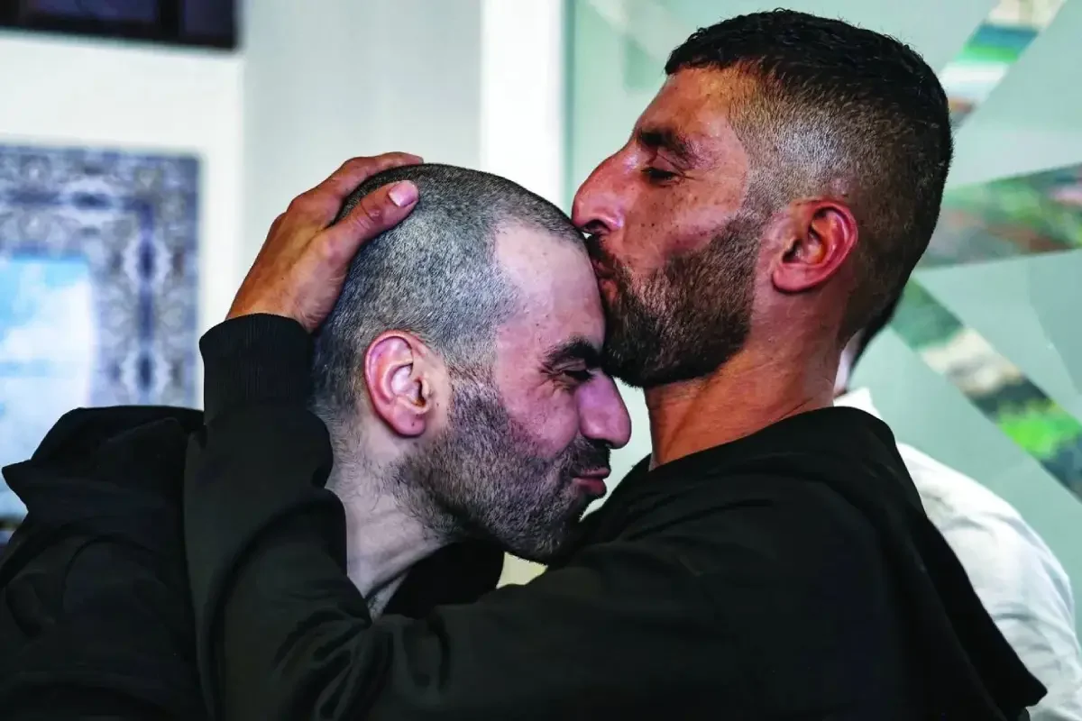 ഇസ്രായിലും ഹമാസും തമ്മിലുണ്ടാക്കിയ വെടിനിര്‍ത്തല്‍, ബന്ദി കൈമാറ്റ കരാറിന്റെ ഭാഗമായി ഒഫെര്‍ ജയിലില്‍ നിന്ന് വിട്ടയച്ച് റാമല്ലയില്‍ എത്തിയ ഫലസ്തീന്‍ തടവുകാരനെ (ഇടത്) സഹോദരന്‍ ചുംബിക്കുന്നു
