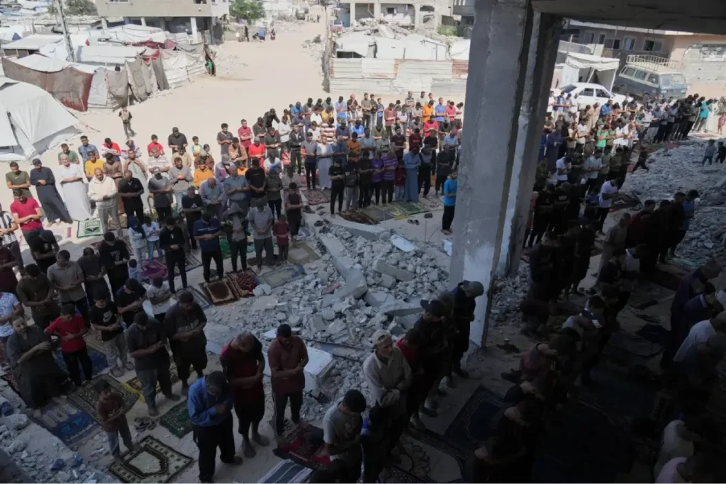 ഖാന്‍ യൂനിസിലെ തകര്‍ന്ന കെട്ടിടത്തിനു സമീപം ജുമുഅ നമസ്‌കാരത്തില്‍ പങ്കെടുക്കുന്ന ഫലസ്തീനികള്‍.