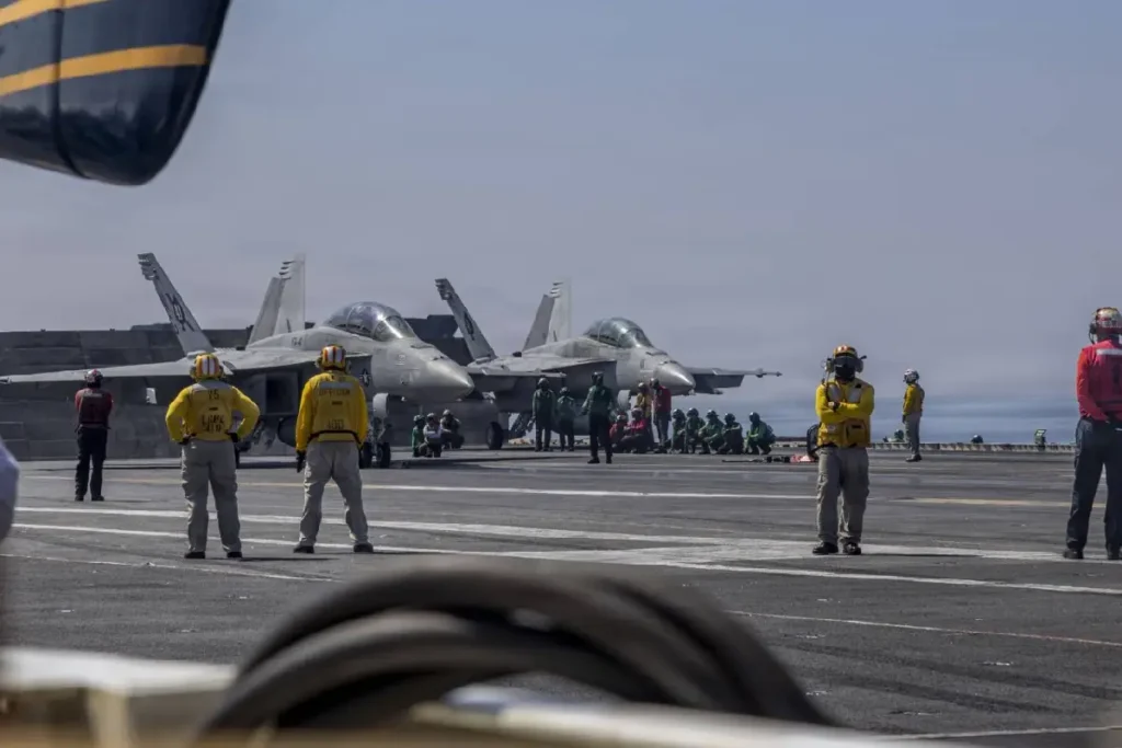 അറബിക്കടലില്‍ യു.എസ്.എസ് എബ്രഹാം ലിങ്കണ്‍ എന്ന വിമാനവാഹിനി കപ്പലില്‍ നിന്ന് പറന്നുയരാന്‍ തയ്യാറെടുക്കുന്ന എഫ്-18 എഫ്എ സൂപ്പര്‍ ഹോര്‍നെറ്റ് യുദ്ധവിമാനങ്ങള്‍